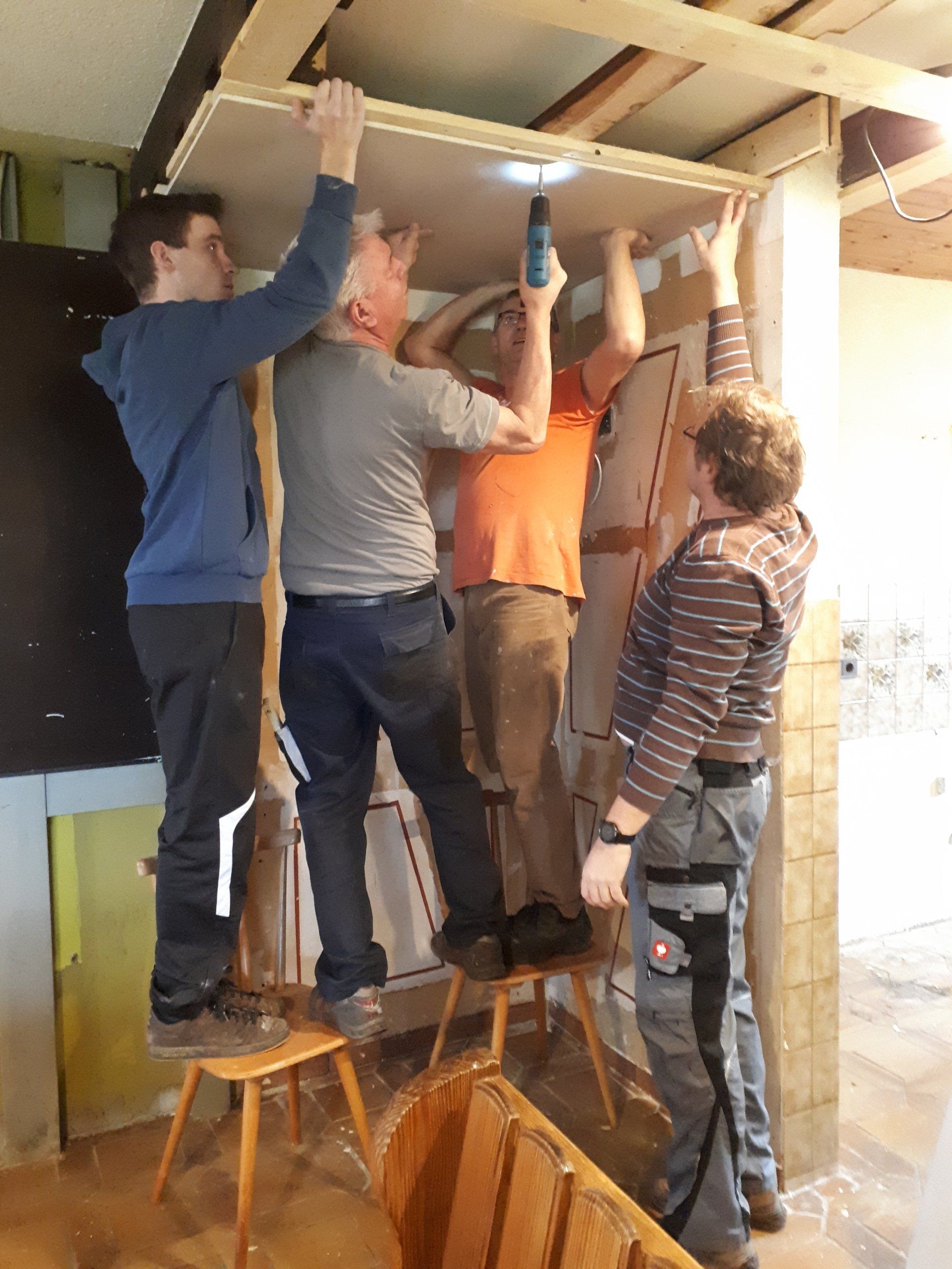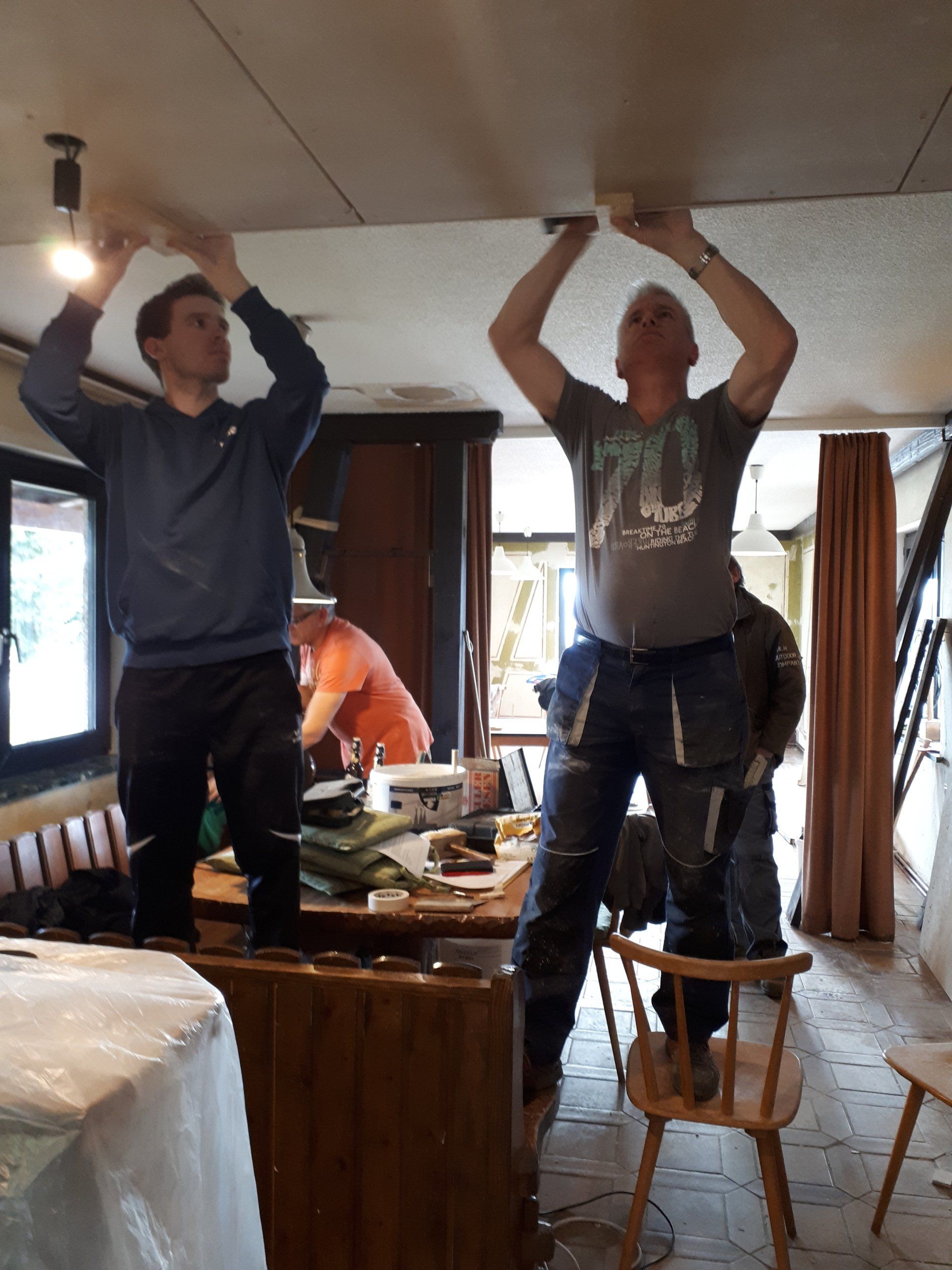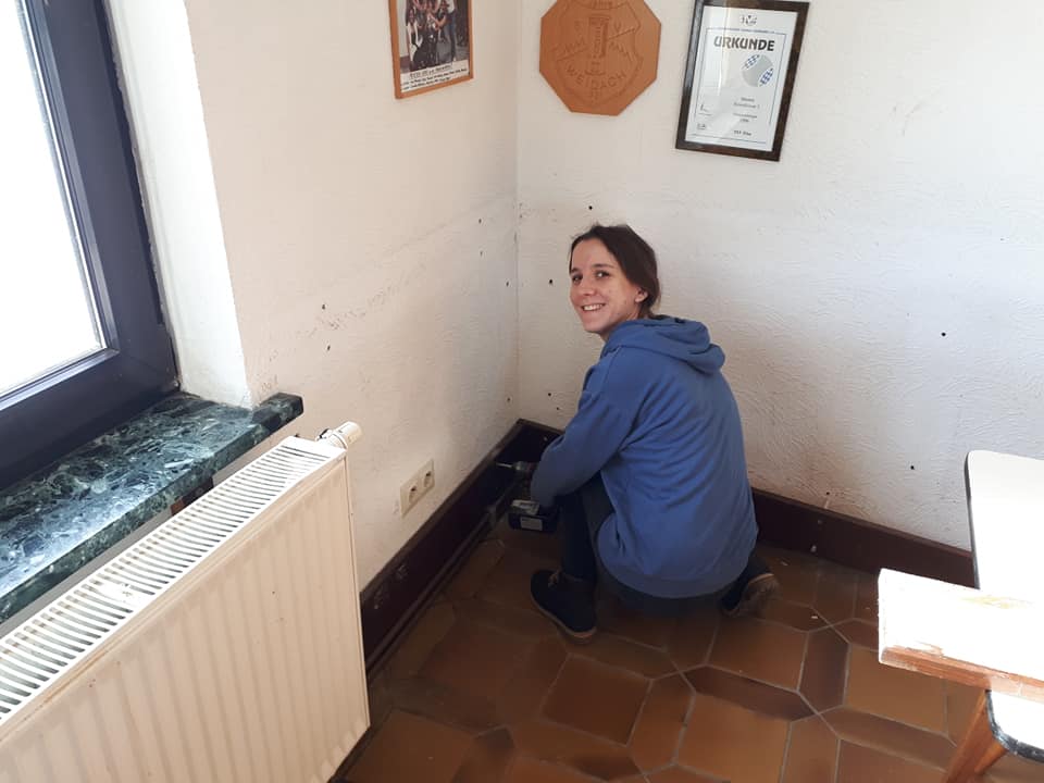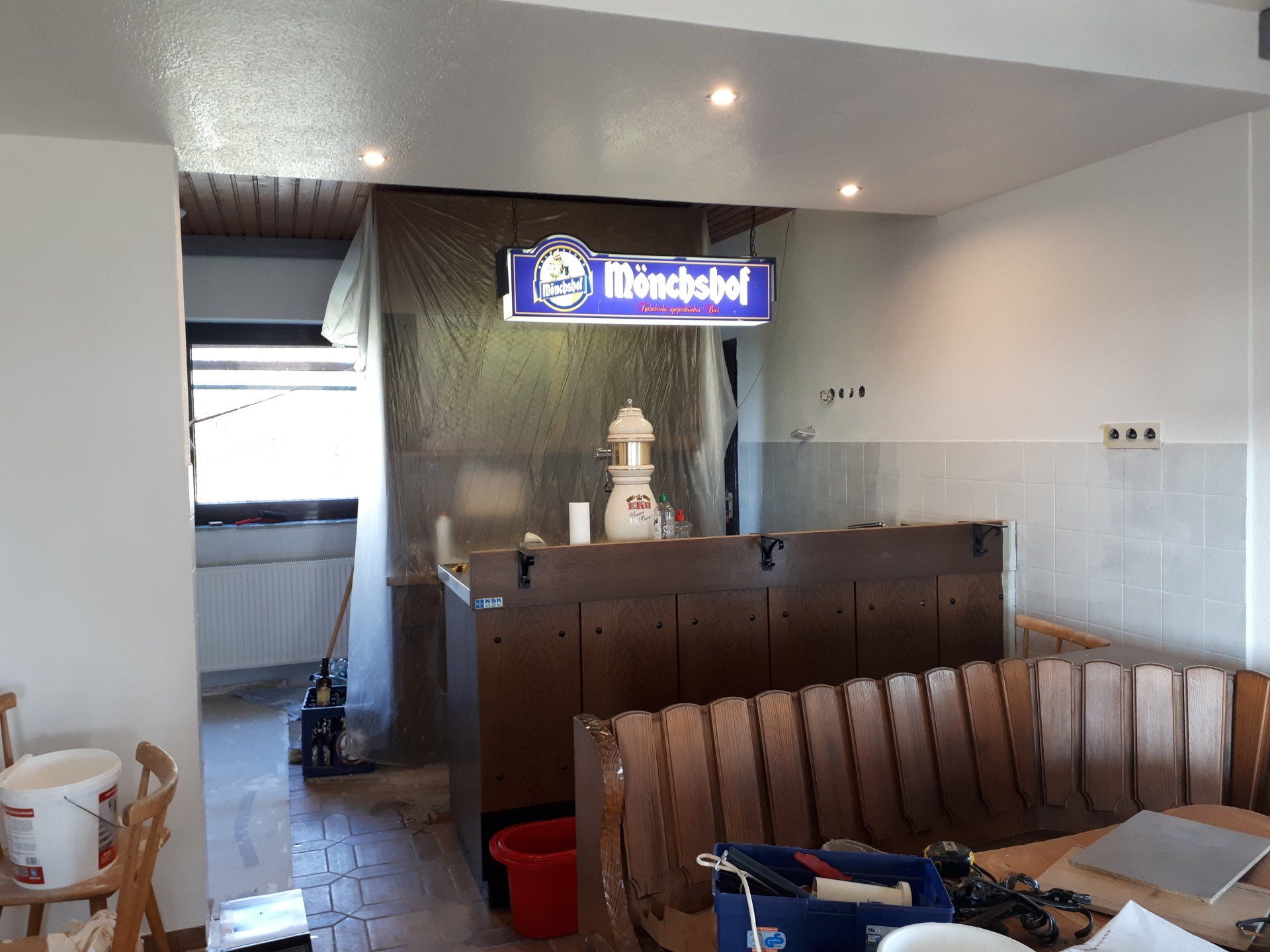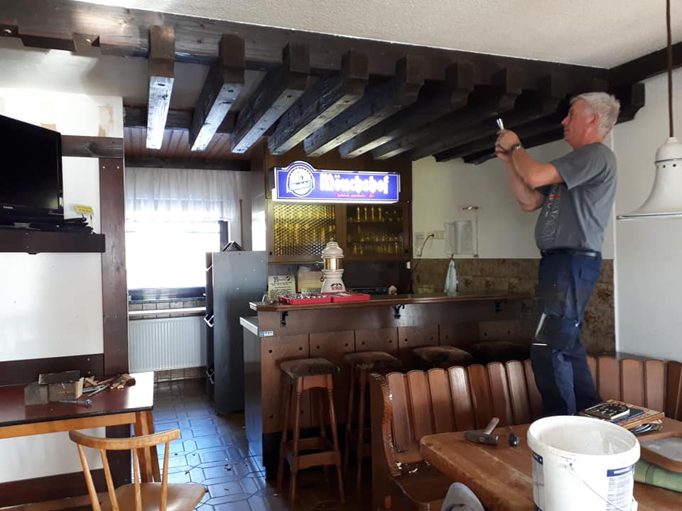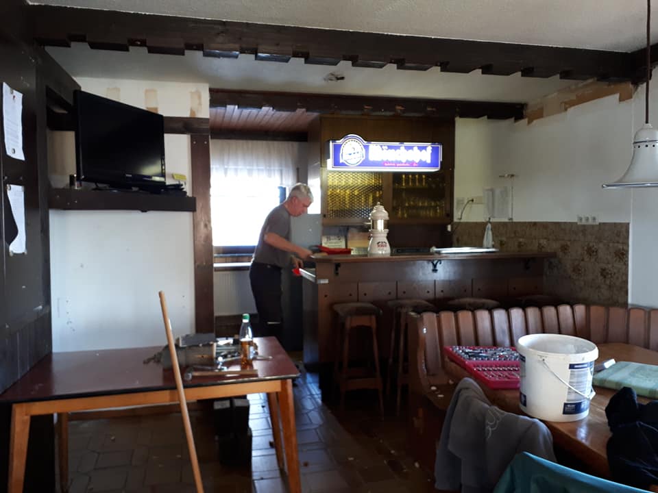 Wie bei jeder Renovierung, musste am Ende mehr gemacht werden als gedacht. Es wurden Tapeten entfernt, Wände verputzt und gestrichen, im Thekenbereich Balken entfernt und LED Spots installiert. Außerdem sind ein neuer Sicherungskasten, Pokalschrank und eine neue Küche eingezogen. Und natürlich viele, viele Kleinarbeiten...